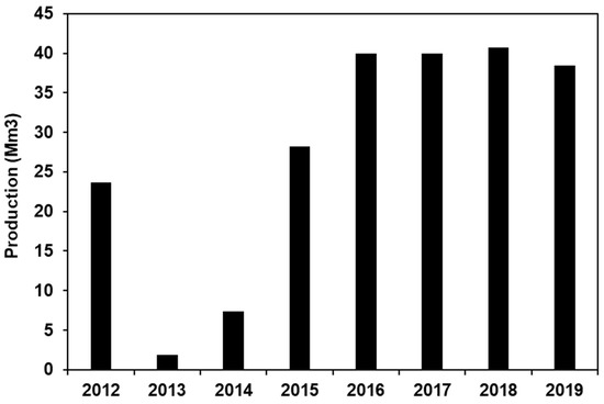 The costs incurred for discharging the brine ranged from 1336 € in 2013 to 89,390 € in 2019. Energy consumption and economic cost are directly related to the production of desalinated water; thus, higher output from the San Pedro del Pinatar SWRO plants implied more brine discharge and higher pumping energy [1,12]. Since 2015, the freshwater production has increased to approximately 20 Mm3, representing an increase of approximately 42% in the maximum freshwater production capacity of both plants. The annual variability observed in the fresh water production has been explained with the availability of water from different sources and prioritizing the cheapest water resources available [1,21]. Therefore, there was a significant reduction in desalinated water production in 2013 and 2014 due to the abundance of water from other resources during these years [21].