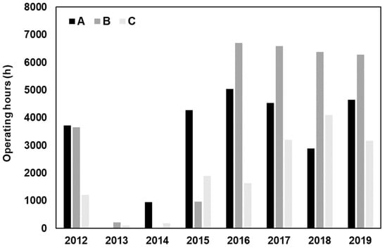 Operating hours of the pumps used to evacuate the brine discharge between 2012 and 2019. Pumps A and B have a frequency variator and pump C has a starter.