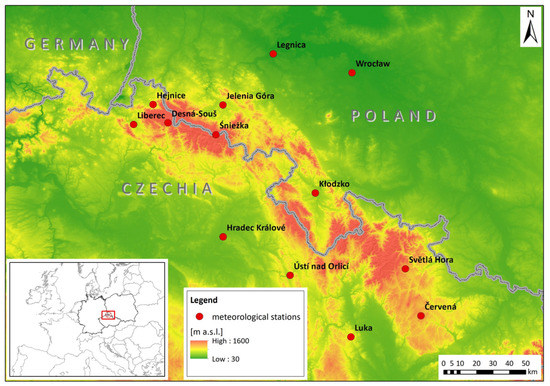 Polish and Czech meteorological stations in the Sudetes Mountains and their foreland.