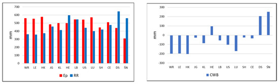 Such a distribution of RR and Ep reflected in the variability of CWB. In the lowlands, the deficit of CWB amounted to 200 mm, while the positive balance was noticed for the stations located at the highest altitude (Desná-Souš and Śnieżka), where the surplus exceeded 200–250 mm. The values of CWB reaching almost 100 mm were also observed in Hejnice, where they were contributed by very high RR. It should also be emphasized that the stations located in the lower mountain zones in the west (Jelenia Góra, Liberec) were characterized by a minor CWB deficit if compared to the eastern areas (Kłodzko, Ústí nad Orlicí, Luka), mainly due to the significantly higher RR.