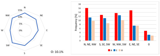 Frequency of particular circulation sectors and classes (a—anticyclonic, c—cyclonic, o—transitional) in the warm half-year of 1981–2020 in the Sudetes Mountains and their foreland; according to the calendar of circulation conditions [109].