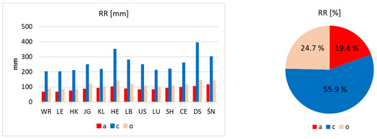 Mean precipitation totals (RR) in the warm half-year (May–October) of 1981–2020 at the selected meteorological stations (left) and the mean fraction of precipitation totals (right) under the anticyclonic (a), cyclonic (c), and transitional (o) conditions in the Sudetes Mountains and their foreland.