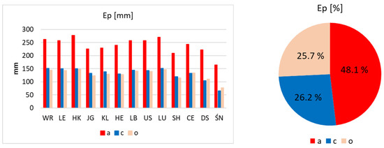 Unlike RR, the highest rates of Ep were observed for the anticyclonic circulation (Figure 6). Nearly half of the total Ep was noticed for this type of weather, while the percentage for the cyclonic and transitional circulation amounted to 26% each. The highest Ep under the anticyclonic conditions was noticed at the stations located lower down and in Liberec, Ústí nd Orlicí, and Luka, where they amounted to 257–277 mm. In the higher zones, the values were noticeably lower, reaching 210–242 mm in Světlá Hora, Červená, and Desná-Souš and 165 mm on Śnieżka. Relatively low Ep rates were also noticed in the mountain valleys (Jelenia Góra, Kłodzko).
