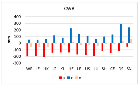 Mean values of climate water balance (CWB) in the warm half-year (May–October) of 1981–2020 under anticyclonic (a), cyclonic (c), and transitional (o) conditions at the selected meteorological stations in the Sudetes Mountains and their foreland.