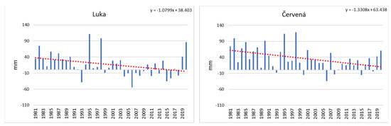 Mean values of CWB and their trend in the warm half-year (May–October) of 1981–2020 in Luka and Červená under the S-types of the cyclonic circulation.