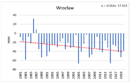 Subsequently, the values of CWB were assessed based on the differences between precipitation totals (RR) and evapotranspiration (Ep). The results of calculations for the particular warm half-year periods of 1981–2020 were the base for the evaluation of multiannual changes in RR, Ep, and CWB in the region. The trends of the considered indices were examined in terms of their statistical significance at the level of 0.05. In this case, the linear regression analysis was applied, additionally verified using the Mann–Kendall test.