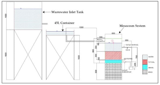 Homogenous domestic sewage stored in the inlet tank was first gravity flowed into a 45 L container for accurate volume measurement and subsequently dosed into the wetland mesocosm. The initial depth of the wastewater in the mesocosm system was set at 300 mm from the topsoil’s surface. The initial water depth was limited by the height of the column and the available space above the soil surface. The wastewater was released until a depth of 150 mm for water sample collection, so as to ensure that the soil in the column would still be inundated with wastewater and to allow room for the next wastewater dosing. The effluent was collected from the mesocosm outlet after 48 h of retention. For the heavy metal analysis, soil and plant samples from the leaves, stems, and roots were also collected. The experimental setup is shown in Figure 1, while Figure 2 shows the experimental mesocosm layout.