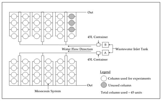 Mesocosm system layout. Due to the limited space for the experimental setup, domestic sewage will flow under gravity from separate wastewater inlets of Tank A and Tank B to two different sets of columns. The total columns used in the experiments are 45 units, with three columns used as the control without plants. The diameter for each column is 600 mm.