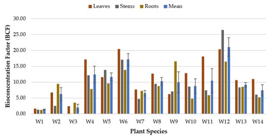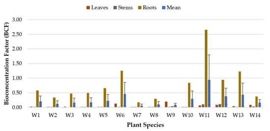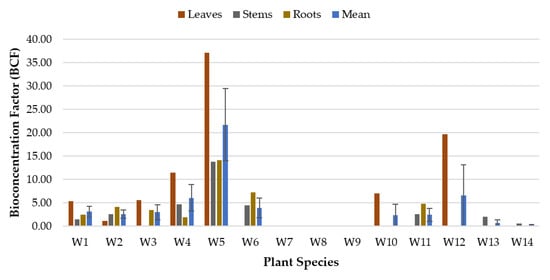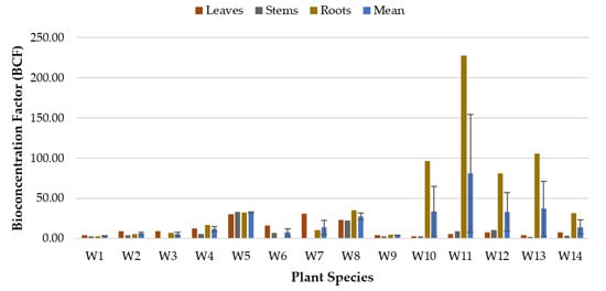 As for the phytoremediation study of Mg (Figure 5), all of the plant species demonstrated BCF values higher than 1 for all of the plant parts (except the roots for W6 and stems for W7), indicating that almost all plant species were capable of accumulating Mg in almost every part of their plant tissues (leaves, stems, and roots). W11 exhibited the highest potential to accumulate Mg in the roots with a BCFroot value of 227.44, followed by W13 (BCFroot 105.56), W10 (BCFroot 96.10), W12 (BCFroot 80.89), W8 (BCFroot 35.39), and W14 (BCFroot 31.61). W7 accumulated Mg better in the leaves than other plant species (BCFleave 30.74), whereas W5 demonstrated a uniform or balanced accumulation of Mg in all plant parts (leaves, stems, and roots) with BCFleave, BCFstem, and BCFroot values of 30.43, 32.91, and 32.55, respectively. One-way ANOVA tested using BCFmean values displayed that there was no significant difference (p = 0.708) between all of the plant species, suggesting that all plants were capable of bioaccumulating Mg at various concentrations in all of the plant parts.