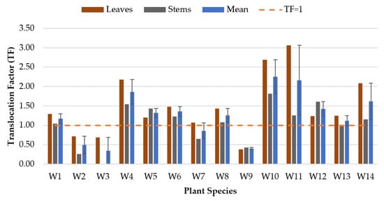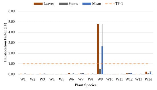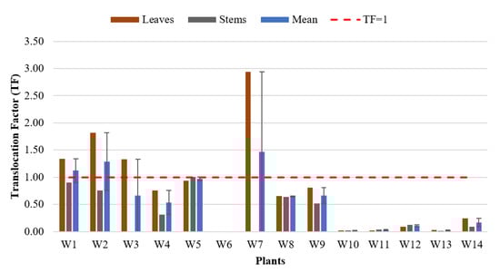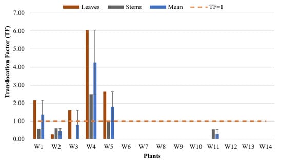 The translocation factor (TF) is used to determine the potential of plants for phytoremediation purposes. It can be calculated from the ratio of the examined metal concentration in the leaves or stems compared with the examined metal in the plant roots [46] based on the following equation: