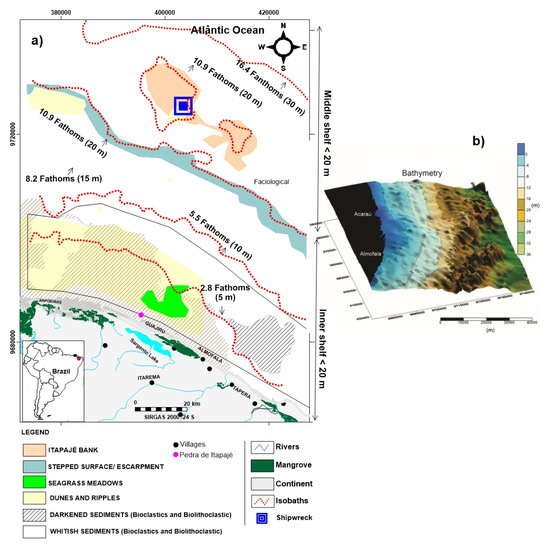 The first step was to edit a basic map with the following information: (a) Three geomorphological macro-compartment limits of the continental shelf [35,45] and their respective sedimentary facies [37] (Figure 2a); (b) Bathymetric map compiled from nautical charts from the Brazilian Navy and Database’s Geodiversity Beach-Continental shelf Project (GBCSP-project), Figure 2b; (c) Distance scale in fathoms and meters; (d) Spatial representation of shipwrecks, coastline, mangroves, drainage, and villages (Figure 2). This map made possible the spatial positioning of the respondents, who use the landmarks on land and the distance from the coast as elements for navigation.