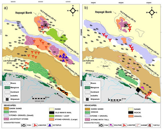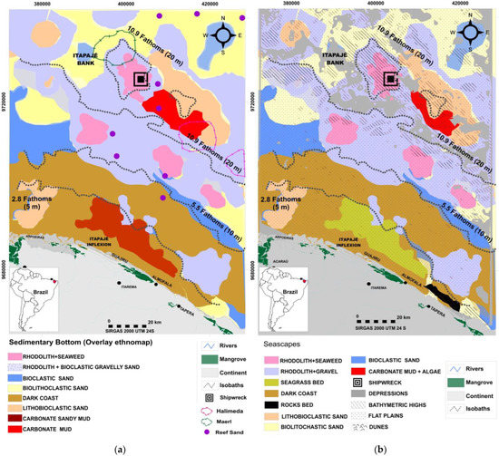 In this sector, there is also a more abundant form of “tail stones” and “jackfruit stones”, mainly associated with rhodolith and bioclastic gravel sands with rhodolith and lithobioclastic sands of varying sizes (Figure 6a). There are records of live red algae and maerl and the occurrence of Halimeda incrassata [50]. The interpolation of the results of the participatory mapping with the map produced from the reanalysis of data revealed that the areas with seagrass meadow, rhodoliths, bioclastic gravels, and the Dark Coast may occupy a much larger area than recorded in the geological and geomorphological surveys published so far. It should be noted that the surveys with detail in the region were carried out by the GBCSP-PRONEX Project [46] in the inner shelf (<10 m), in the years 2013 and 2018, the other studies contemplated a regional scale. The take-home message is that it is possible (and desirable) to make the local people’s perceptions of the habitat distribution match with the scientific mapping, being a necessary calibration.