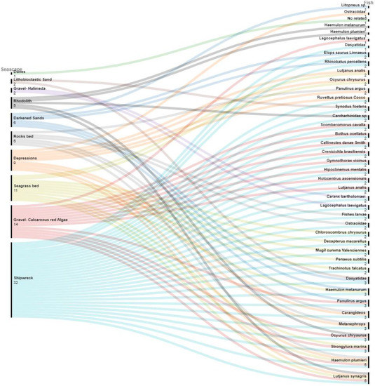 The diversity of substrates starting from the 10 m isobath is reflected in the increase in fish species, mainly associated with gravel bottoms with the presence of carbonate algae (Figure 6b). However, it was observed that species such as the lobster Panulirus argus occur from areas close to the coast to seascapes located at greater depths associated with carbonate bottoms [52,67]. From the 20 m isobaths, there is a high diversity of geomorphological features, with a predominance of bathymetric highs with flat bottoms and/or capped by rhodoliths, carbonate gravels, halimedas, and maerl [37,55], favoring a greater diversity of species, as observed in the description of the species caught in the wreck, which is located in an area with characteristic reef environments.