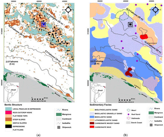 (a) Benthic Structure map; (b) Sedimentary Facies map. Source: Figure 5b elaborated from integration of different data [35,37,40,46,50,51,52,53,54,55,56].
