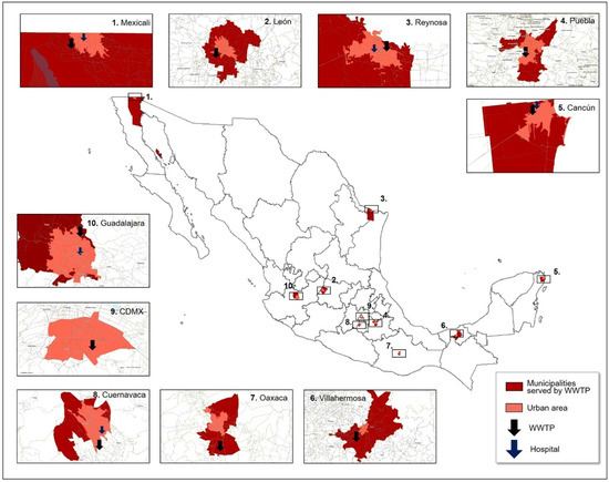 We selected 10 WWTPs for sampling using the following inclusion criteria: (1) located in a major urban conglomerate (>100,000 inhabitants), (2) located in a municipality within the 90th percentile of municipalities by COVID-19 attack rate (confirmed cases per 1000 inhabitants), and (3) influent flow above 10 L/s (to minimize viral load variability due to flow changes). We identified municipalities that fulfilled the criteria using the official COVID-19 dashboard from the National Institute of Public Health [https://www.insp.mx/informacion-institucional-covid-19.html (accessed on 30 September 2020)], and the official WWTP inventory from the National Water Commission (CONAGUA). The selected WWTPs were: Agua Prieta (Guadalajara Metropolitan Area), Cerro de la Estrella (Mexico City), San Francisco (Puebla Metropolitan Area), Zaragoza (Mexicali), León (León), Reynosa I (Reynosa), Norponiente (Cancún), Acapantzingo (Cuernavaca), La Raya (Oaxaca Metropolitan area). WWTPs personnel were contacted and asked to collaborate in the study through the official channels of CONAGUA; all selected WWTPs agreed to collaborate. We then selected 5 hospitals for effluent sampling using the following inclusion criteria: (1) designated for COVID-19 patients, (2) located within the catchment area of one of the selected WWTPs, and (3) held 50% or more of the COVID patient beds in the WWTP’s catchment area, which we estimated using official data from the Health Ministry. The 5 selected hospitals were in Guadalajara, Mexicali, Reynosa, Cancún, and Cuernavaca. Hospital personnel were contacted and asked to collaborate in the study by local CONAGUA personnel; all 5 hospitals agreed to participate. Sampled sites are shown in Figure 1.