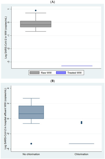 SARS-CoV-2 RNA quantification in 24 h composite samples in (A) raw and treated wastewater from 3 WWTP (pilot phase 23 September 2020 to 4 October 2020) and (B) disinfected and no disinfected effluents from 5 COVID-19 hospital (sampling period 7 October 2020 to 29 November 2020). The points are potential outliers defined as the extreme values outside the 1.5 interquantile range of each distribution.