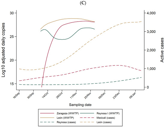 Adjusted Log10 SARS-CoV-2 RNA daily load and active cases temporal trend by WWTP, Mexico, October–November 2020. (A) Large WWTP; (B) Medium WWTP; (C) Small WWTP.