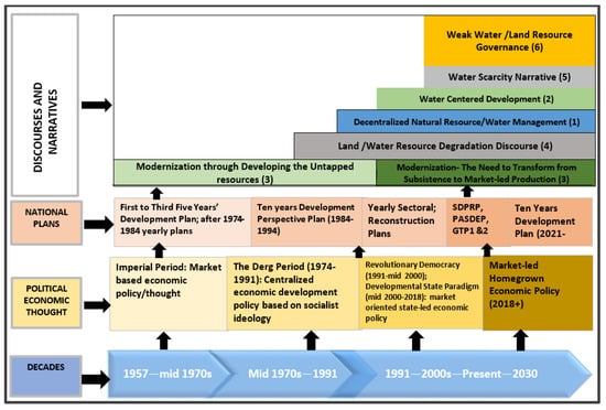 There are dominant discourses and narratives of water resource management identified as having prevailed in Ethiopia in general and the CRV in particular since the late 1950s (see Figure 2 and Table 1). The late 1950s are considered the beginning of the water discourse, as that was when major hydrological resource potential studies commenced in the country during the periods of the First Five-year National Development Plan (1957–1961) and its successor, the Second Five-year National Development Plan (1962–1967). The types and arrangements of the water governance discourse and narratives are presented here along with the ideologies and the political economic policies adopted by successive Ethiopian governments. Those are the Free-market Economic Policy of the Imperial Government (before 1974), the Command (socialist) Economic Policy of the Derg (Derg—is the provisional Military Council that deposed the Emperor Hailieslassies’s regime in 1974 through the popular revolution and changed the imperial government’s ideology to socialist ideology which reign from 1974–1991), and the Free-market-oriented but mixed economic policies since 1991. In each of these three periods, successive governments adopted specific national plans. The discourses and narratives on natural resource management in general and water resource management in particular were closely related to those ideologies and the accompanied national policies and plans.