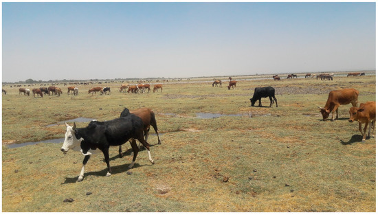 Our several interview results show that the most frequently mentioned reason is usually given by local residents (particularly the youth), who assert that the lake’s water is “their water resource”, and some experts agree that the lake’s volume has dwindled because of the Soda Ash Factory. The Soda Ash Factory was established at the shores of Lake Abijata in 1989 and produces soda ash, a form of hydrous sodium carbonate (Na2CO3), by evaporating water pumped from the lake in artificially constructed ponds for the crystallization of trona. It has been reported that the factory was pumping about 1.5 million m3 of water annually to produce about 10,000 tons of soda ash per year [58], which is <0.4% of the current lake volume. For several reasons, the factory halted its production for the last three years but now plans a resumption. Given the relatively small amount of annual abstraction and that the water is saline and never used for irrigation, domestic water supply, or animal watering, the reason given by local residents is doubtful. Their assertion is said to be motivated by politics, as the water has never been used by the residents, which is driven by the current political activism and also shows a sort of political power shift to the locals. On the contrary, livestock owners are happy with the extensive retreat of the lake, which yields large tracts of grazing land (Figure 5 shows a herd of livestock grazing on the shore of the lake; field visit, 2020). The FGD with Soda Ash Factory staff revealed that the shrinkage of the lake is due to smallholders and large-scale commercial farms over-abstracting water from Lake Ziway and the Bulbula river that drains into this terminal lake, heavy sedimentation of the lake from the upslope due to land cover changes, and climate change.