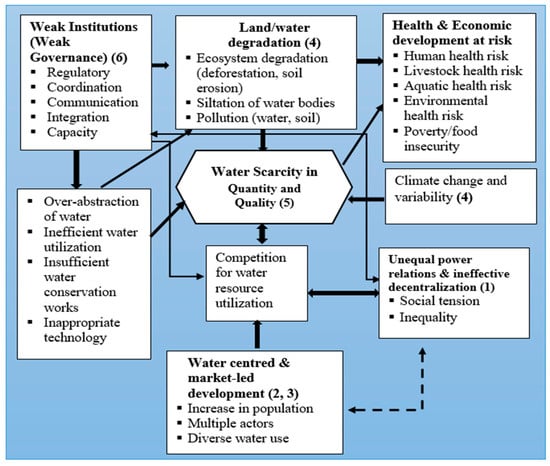 The perpetual need for an adequate supply of safe water to aid a decent living standard is unquestionable. This need is growing rapidly for both domestic use and economic development (agriculture, energy, and industry). For many developing countries, water resource development and management remain at the heart of efforts to achieve sustainable development, economic growth, and poverty reduction [1]. At the same time, there is growing competition between different types of water usage, including environmental flow and water users [2]. However, most developing countries have yet to adequately adapt their water infrastructure and institutions to meet the rising demand. In Ethiopia, the unmet demand and challenges of water resource development and management are diversified by a multitude of factors and drivers, at the core of which is weak governance.