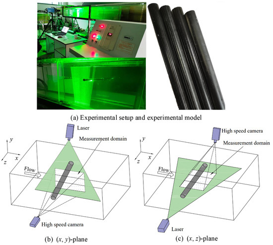 The experimental setup is shown in Figure 2a. The velocity fields of the four models were measured using particle image velocimetry (PIV). The experimental model was placed in the middle depth of the channel and its length was equal to the width of the aqueduct. The test section of the water channel was 0.3 m × 0.4 m × 1 m (width × height × length) and its wall thickness was 0.01 m. The two side walls of the circulating water channel were transparent glass plates to allow for laser illumination and visual assessment of the PIV measurements. A rectifier grid was fitted before the test section to ensure flow homogeneity. The free-stream turbulence intensity was less than 0.5%. The water flow velocity () in each case was recorded by a flow meter and calculated for the test section (where Q = 160 m3/h is the flow quantity and S = 0.12 m2 is the area of the cross-section). The free-stream velocity was fixed () in the PIV experiment corresponding to a Reynolds number of Re = 7400 based on the experimental model.