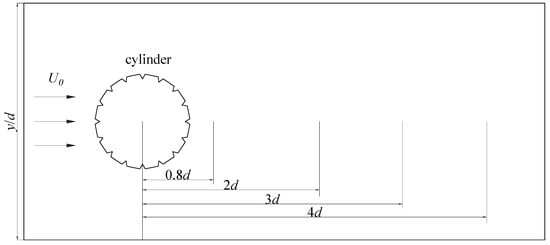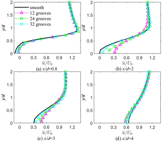 At the location of x/d = 0.8 (Figure 4a), the velocity gradient of the smooth cylinder is more significant than that of the three grooved cylinders. The velocity profiles in the y-direction can be divided into reflux, shear-velocity, and stable sections. The reflux section is part of and the stable section is where the velocity gradients are nearly zero. Furthermore, the shear-velocity section is the transition between the low- and high-speed parts. The widths of the stable sections of the four cases are the same. The widths of the reflux sections of the three grooved cylinders are reduced. This indicates that the surface of the v-groove reduces the reflux section.