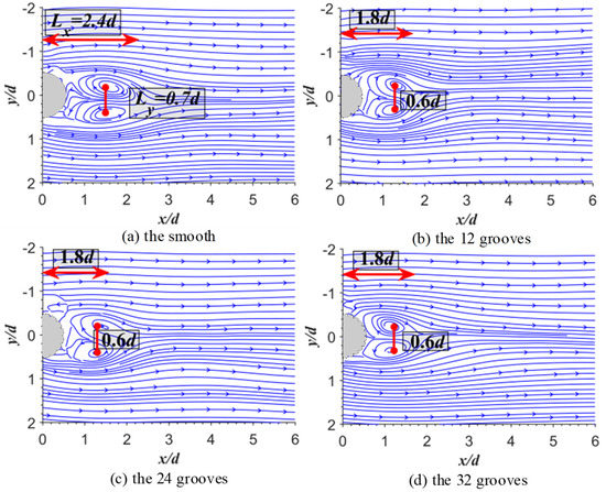 In the present study, the time-averaged streamlines were calculated by averaging over 8000 instantaneous velocity vector fields. For the time-averaged streamlines in the (x, y)-plane (Figure 6), the sizes of the recirculation regions were compared. The size of the recirculation region was obtained from the velocity flow diagram, which was symmetric about y/d =0. The wake circulation region can be described by the values of (length from the center of the cylinder to the saddle point) and (the width between the two foci points) [18,19]. The widths of the two vortices in the three v-groove cylinders were all 0.1d shorter than that in the smooth cylinder, and the of the three v-groove cylinders were all reduced by about 25%. The vortex formation region of the v-groove cylinder decreased, as did that of the longitudinal U-groove cylinders [20]. However, the change in the number of grooves did not affect the size of the recirculation region.