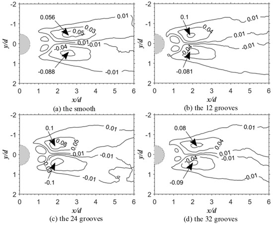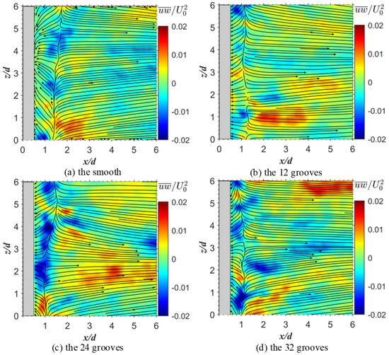 Furthermore, Figure 8 shows the time-averaged streamlines and normalized Reynolds stress () in the (x, z)-plane. The minimum length of the reflux region of the smooth cylinder was about 1.4d, whereas the minimum lengths of the reflux regions of the 12-, 24-, and 32-groove cylinders were about d, 0.8d, and 0.4d. The above phenomenon indicates that the v-groove surface increased the disturbance at the boundary layer so the length of the reflux region was reduced. This result is consistent with the streamline diagrams shown in Figure 6.