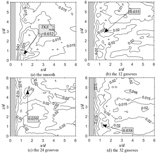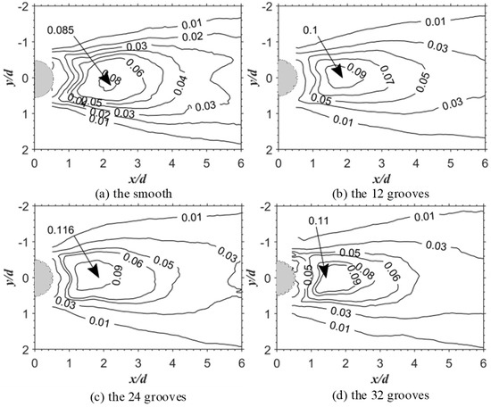 As shown in Figure 9, the turbulent kinetic energy (TKE) was also used to determine the turbulent instability [21]. The turbulent kinetic energy was calculated as TKE= 0.75(). The maximum value (TKE = 0.085) of the smooth cylinder was observed at x/d = 2.4 (Figure 9a), which was longer than the locations of the three grooved cylinders. In addition, the peak values of TKE for the 12-groove, 16-groove, and 24-groove surfaces were 0.1, 0.116, and 0.011, respectively (Figure 9b–d). The maximum turbulent energy of the 32-groove cylinder was less than that of the 24-groove cylinder, which indicates that the number of grooves had a limited effect on the turbulent kinetic energy. This also means that increasing the number of grooves will not result in more turbulent momentum to prevent vortex shedding.