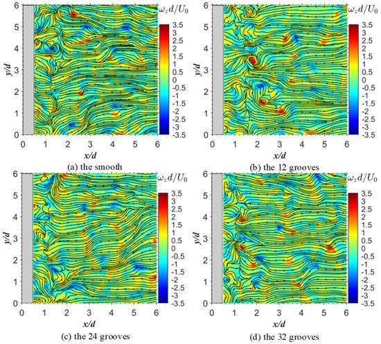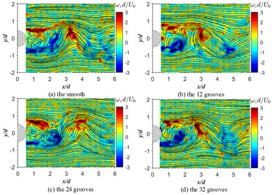 Figure 12 plots the instantaneous streamlines and normalized vorticity contours of the smooth and grooved cylinders in the (x, z)-plane. More vortices can be seen in the wake regions of the 12-, 24-, and 32-groove cylinders than the wake region of the smooth cylinder because of the interaction of the violent turbulence and the v-groove surface.