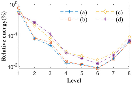 The energy contribution of each scale is shown in Figure 13, where it can be seen that the relative energy of the level 1 wavelet component had the most prominent energy share. The sum of the energy share of the level 1238 wavelet component reached 0.9, whereas the sum energy share of the level 1238 wavelet component of the smooth and 32-groove cylinders in the (x, z)-plane reached 0.91, which was the same as the results in the (x, y)-plane. The sum of the levels 1, 2, 3, and 4 wavelet components approximated the measurement data. However, the level 8 wavelet component is a high-frequency wavelet coefficient and is of no research value [15]. Therefore, the levels 1, 2, and 3 wavelet components were selected to study the multi-scale wavelet structure.