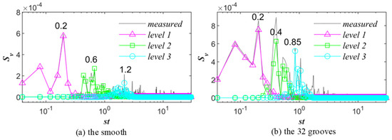 The flow fluctuation velocities of the smooth and 32-groove cylinders were chosen to reveal the spectral characteristics of the four wavelet components. The Strouhal number (St) was calculated from each wavelet component’s center frequency (). The power spectra were calculated at selected points (x/d = 0.6, y/d = 0.5) to obtain the central frequencies of the flow fluctuation velocity in the wavelet components at levels 1, 2, and 3 (Figure 14). For the smooth and 32-groove cylinders, the maximum peaks of the measured data and level 1 wavelet component were observed at and , indicating that the vortex shedding had slowed behind the 32-groove cylinder. In addition, the smooth cylinder’s peak spectra of wavelet components at levels 2 and 3 were located at around 0.6 and 1.2, respectively. The pronounced spectrum peaks of wavelet components levels 2 and 3 for the 32-groove cylinder were observed at around 0.4 and 0.85, respectively. So, the level 1, 2, and 3 wavelet components were selected to represent the large-, intermediate-, and small-scale structures.