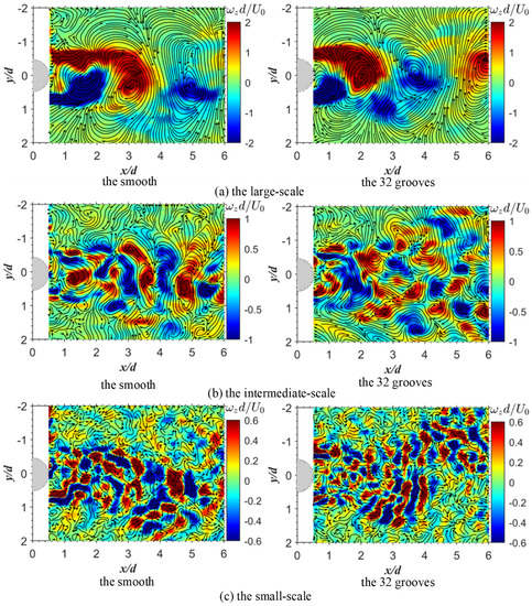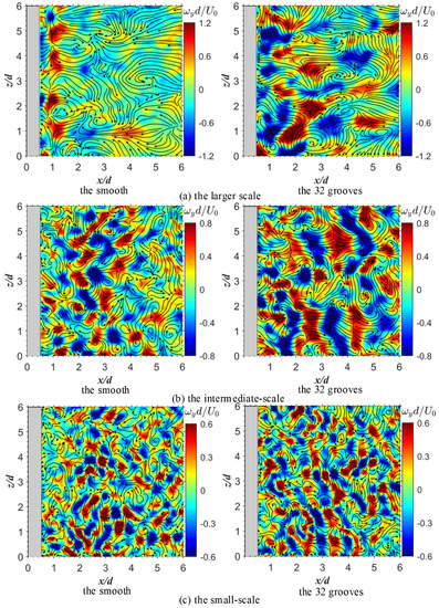 Figure 16a shows vertically oriented ribbed eddies in the wake circulation region, while downstream there were ribbed eddies in the flow direction. When comparing the smooth and 32-groove cylinders at the large scale (Figure 16a), it was observed that the ribbed vortex behind the 32-groove cylinder was shorter. This indicates a more substantial wake disturbance for the 32-groove cylinder, which is consistent with the results of the flow plane. When the scale was reduced to intermediate and small scales (Figure 16b, c), many ribbed vortices were observed perpendicular to the flow direction. This indicates that the vortex diffusion was concentrated in the (x, y)-plane.