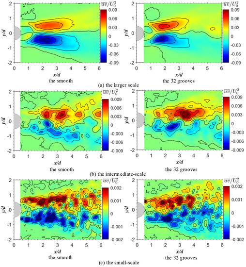 As shown in Figure 17a, the Reynolds shear stresses were more significant in the wake behind the grooved cylinder, and the position of the peak advanced further upstream. This indicates that the v-groove cylinders caused a narrowing of the velocity shear portion of the wake, which corresponds to Figure 7. At the intermediate scale (Figure 17b), the maximum shear stress of the 32-groove cylinder was more significant than that of the smooth cylinder. The shear layer instability increased the intensity of turbulence behind the v-groove cylinders. When comparing the small-scale structures' instabilities (Figure 17c), which represent the locations of the shear layer instabilities, it can be seen that the dissipation of the internal shear stresses was caused by shear-to-rotation transport processes and the dissipation of the internal shear stresses behind the v-groove cylinder had advanced.