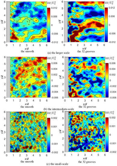 Figure 18 shows the Reynolds shear stress distributions in the (x, z)-plane. It can be seen that the maximum Reynolds stress region of the 32-groove cylinder was broader and more robust than that of the smooth cylinder at the large scale (Figure 18a). These results are the same as the Reynolds shear stress at the large scale in the (x, y)-plane. At the intermediate scale (Figure 18b) and the small scale (Figure 18c), the location of the positive and negative region in the 32-groove cylinder appeared to be closer to the cylindrical wall surface than in the smooth cylinder. This also means that the shear stress caused turbulent instability in the recirculation region.