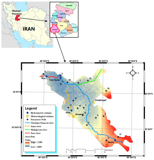 The Shazand Plain area is located in the Qarachai watershed in the southwest of Markazi Province in Iran, with an area of 984 sq. km. Figure 1 shows the location of the Shazand Aquifer. It lies between the north latitudes of 33°43′ to 34°11′ and east longitudes of 49°16′ to 49°52′. According to the Geiger–Koppen classification, Shazand’s climate is continental (Dsa). It has warm summers and cold winters due to its mountainous area and elevation of 1920 m above mean sea level. Shazand is one of the coldest regions of Markazi Province. Its mean annual temperature is about 12.4 °C. The daily temperature of the region can reach 33 °C in summer and −25 °C in winter. Due to the location of the Shazand area on the eastern slopes of the Zagros Mountains, most of its precipitation forms due to moist air masses that come from the west, northwest, and southwest [28]. The long-term mean annual precipitation and potential evapotranspiration in Shazand plain are 338 and 2750 mm per year, respectively. There is a rain gauge station to the west and an evaporation station to the east of the study area. According to the Iran Meteorological Organization, precipitation in the west of the region is higher than in the east.