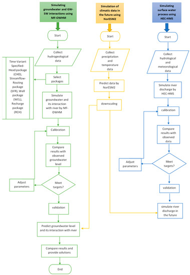 To improve water resource management and prevent further damage to water resources in the Shazand Plain, improved knowledge of surface water and groundwater interaction under future climate conditions is necessary. For this reason, the MF-OWHM was applied to the area using the CHD, WEL, RCH, and SFR packages. The model was calibrated and validated by trial and error. The Norwegian Earth System Model version 2 (NorESM2) under the SSP2 scenario was then used to simulate the future climate. Downscaling was performed to adjust gridded precipitation and temperature data to the catchment area. HEC-HMS was then set up, calibrated, and validated to simulate river discharge. The verified model was used for prediction of river discharge under future climate scenarios. Finally, interactions between river water and groundwater were analyzed using MF-OWHM. Figure 2 presents a brief summary of the methodology in this study.