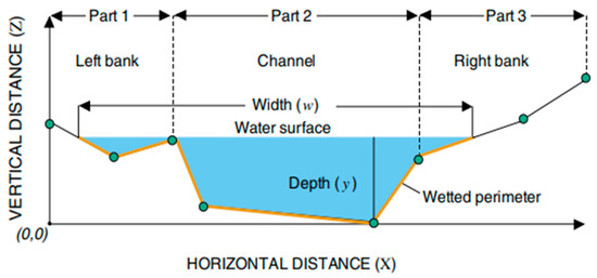 In Equation (2), leakage from the streambed to the aquifer can change depending on the aquifer head and the stream. The flow that seeps from the stream bed to the aquifer is calculated by multiplying the wetted area of the stream by the infiltration rate. The wetted area can be constant or specified based on the stream’s cross-sectional dimensions, discharge, and stage. Manning’s equation is used for calculating the relation between stage and discharge.