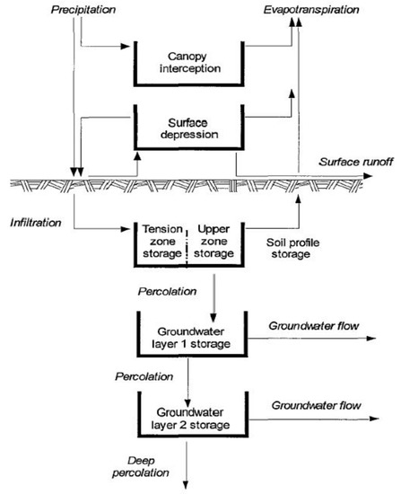 The HEC-HMS model was used to simulate future river discharge by using downscaled climate data. The output of the HECHMS model was used in the MF-OWHM model to simulate future river and aquifer interaction. The HEC-HMS, developed by the US Army Corps of Engineers Hydrologic Engineering Center, is capable of modeling both continuous and event-based runoff [18]. HEC-HMS consists of four components including a basin component, meteorological component, control specification, and input data component. The model uses different methods to transform rainfall into runoff, including the Clark unit hydrograph, SCS unit hydrograph, ModClark, and kinematic wave. The model consists of different methods for computing loss, among which soil moisture accounting (SMA) is a continuous method used for longer periods [31]. The SMA method uses five storage layers to represent the watershed. The layers include canopy interception, surface depression storage, soil, upper groundwater, and deeper groundwater involving twelve parameters (Figure 4).