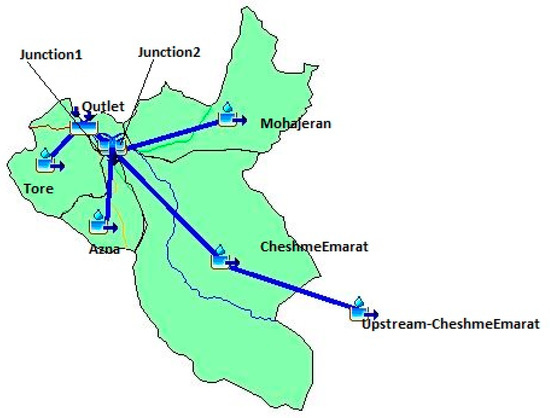 To simulate river discharge in the HECHMS model, the Shazand study area was divided into five sub-basins consisting of two junctions and one outlet (Figure 5). The Clark unit hydrograph method was used to transform rainfall to runoff. The soil moisture accounting (SMA) method was used for loss and the constant monthly method for baseflow. Moreover, daily rainfall data were obtained from two stations (Shazand and Ghadamgah) and daily temperature was collected from the Ghadamgah evaporation station. The evapotranspiration values were computed based on the Hamon method.