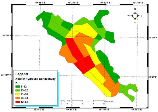 In the next step, the aquifer’s hydraulic conductivity was calibrated by comparing observed and simulated groundwater levels in 17 piezometers. For this purpose, the area was divided into different zones and the hydraulic conductivity of each zone was estimated by trial and error. The hydraulic conductivity varied from 3 to 55 m/day, with the highest values in the middle of the aquifer and the lowest in the northwest of the aquifer (Figure 7). The minimum groundwater level is associated with the piezometers in the east of the region and the piezometers in the northwest have the highest groundwater level in the region.