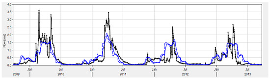 The rainfall–runoff model was calibrated for 2009–2013 and validated for 2013–2014. For this purpose, the observed river discharge at each station was used to compare to the simulated discharge at each station. Automatic model calibration was used to calibrate the Clark unit hydrograph parameters, SMA parameters, and other model parameters such as Muskingum k and x, aiming to maximize the Nash–Sutcliffe and coefficient of determination.