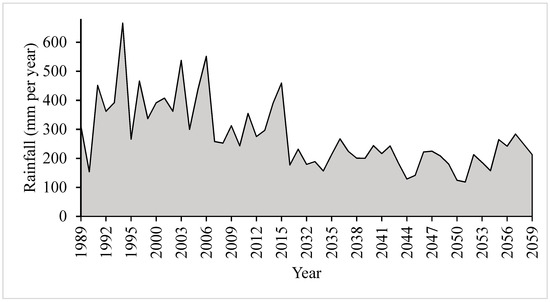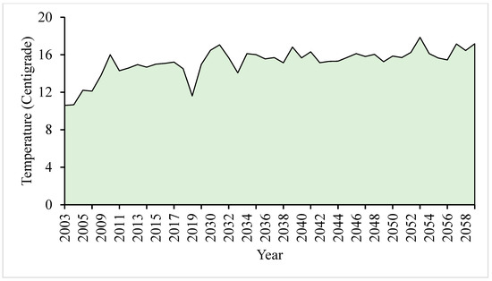 For the Ghadmagah station, the rainfall may decrease from 369 to 202 mm per year (−45%) (Figure 12), and average daily temperature at this station will probably increase by 16% from 13.7 to 15.9 °C (Figure 13). According to these results, the east of the region, which had less rainfall in the past, will have a more severe decrease in rainfall in the future compared to the west of the region.