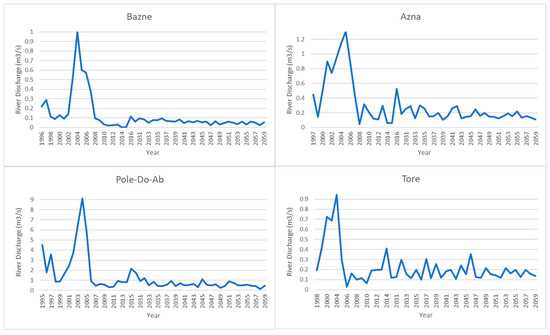 The HECHMS model was used to predict the stream flow using the downscaled climatic data for the period 2030 to 2059. Comparison of the historical long-term annual discharge with the future values showed that the largest decrease may occur at the Bazneh station, by 81%, and the smallest decrease may occur at Tore station, by 58%. The river discharge reductions at the Azna and Pole-Do-Ab stations were 63% and 75%, respectively (Figure 14).