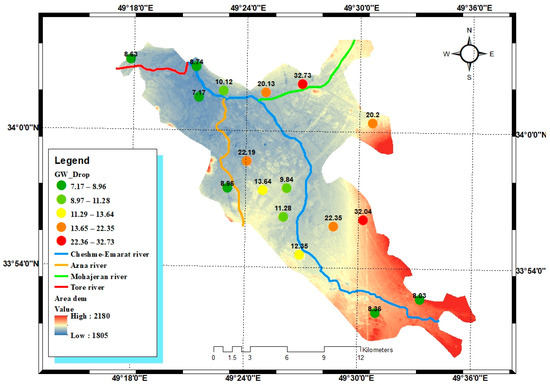 The groundwater level was predicted using MF-OWHM for the period 2030–2059 at monthly time steps. Figure 15 shows the drop in piezometer levels from 2010 to 2059. Piezometer N13, in the northeast of the region, may have the largest decrease, with a drop of about 33 m. In general, under the future climate, the east and northeast parts of the region will probably face larger decreases in groundwater level. The minimum groundwater decrease may occur in the northwest of the region, which is in line with climate model predictions that shows more decline in rainfall in the eastern area. The overall aquifer water level in 2059 is predicted to be about 1857 m, which means that the water level may decrease by 15 m compared to the groundwater level in 2010.