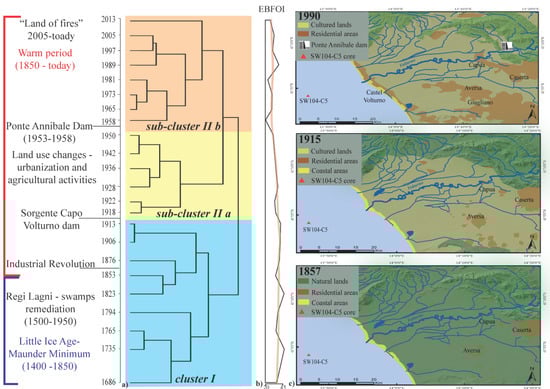 Paleoclimate periods (blue and red from Margaritelli et al. [22]) and anthropogenic interventions. (a) Hierarchical cluster analysis based on benthic foraminiferal relative abundances; (b) Enhanced benthic foraminifera oxygen index (EBFOI) temporal variations with a smooth curve (in orange) based on local polynomial regression fitting added to evidence the main trend; (c) Paleoenvironmental reconstruction and land-use changes in 1857 [58], 1915 [59] and 1990 [60].