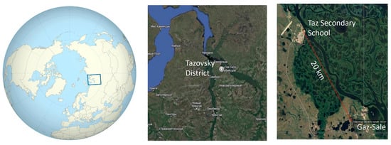 Location map of the general study area: (left), the location in the Yamalo-Nenets Autonomous Okrug (Worldmap northern.svg); (middle), the Tazovsky District (right) showing the location of the Tazovskaya Secondary School and the Gaz-Sale village (Google Maps).
