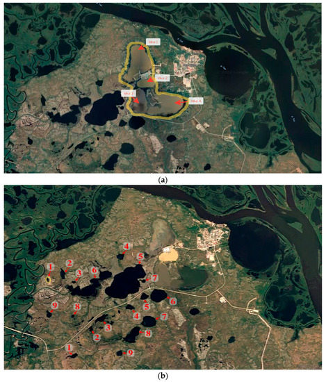 The area has a mixture of organic tundra soils and sandy soils in the continuous permafrost zone [30,31]. The continuity of permafrost is interrupted from the surface only under riverbeds and lakes as well as in relief depressions with dense thickets of shrubs where increased snow accumulation is observed. The thickness of under-channel and under-lake taliks can vary from 3 to 30 m. In the bottoms of depressions, khasyreys, and lower parts of slopes overgrown with shrubs, the depth of taliks is 2–10 m. A characteristic feature of the cryogenic structure of Quaternary deposits is high ice content. High ice content is explained by lower temperatures and a desalinated composition of formation waters due to the existence of a zone of free water exchange in Quaternary rocks before freezing [33]. The active layer varies from 5 to 20 cm. The sandy soils have a stratigraphic structure. They are silty (fine-grained) and 1 to 1.5 m deep, with a layer of blue clay 20–25 cm thick beneath, and a layer of silty sand up to 2 m deep beneath that. Below, is a repeated layer of clay alternating with subsequent layers of sand. Along the road to the western entrance to the Gaz-Sale village, there is a group of disturbed thermokarst lakes (Figure 2a), most of which have degraded since 2000, losing up to 70% of their surface area. These lakes have been subjected to dredging for sand. Nearby, many other undisturbed lakes occur (Figure 2b).