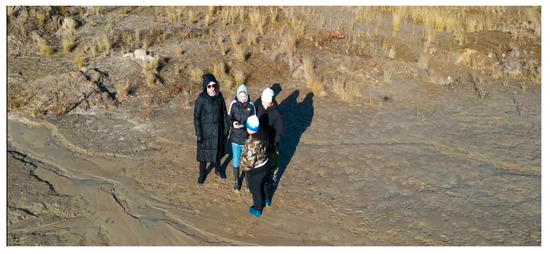 Over the past 8 years, about 200 science students from the Tazovskaya Secondary School have carried out annual monitoring of permafrost thawing and thermokarst lake dynamics in the study area under the supervision of three science teachers, and advice was sought from experts. Students from 11 to 17 years old carried out the following activities: site selection, measurement of lake area from satellite images, drone photography (Figure 4), the study of local industry and ecology, simple statistical tests, laboratory experiments (not included here), and the analysis and presentation of data.