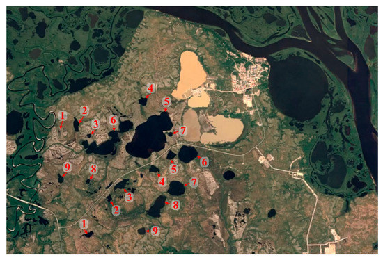 - Soromotin, A.V.; Prikhodko, N.V.; Sizov, O.S.; Dayzel, A.V.; Kudryavtsev, A.A.; Zakirova, M.R. Geoecology of thermokarst lakes of Western Siberia in the zone of influence of an arctic town (a case study of the town of Nadym). Geogr. Bull. 2022, 2, 90–108, (In Russian with English Abstract). [Google Scholar] [CrossRef]
